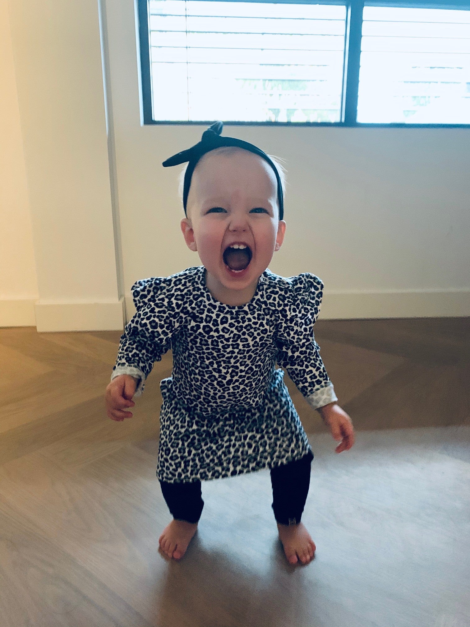 Toen ik verder ging rondneuzen op de website van Babystyling had ik binnen de kortste keren mijn digitale winkelmandje vol met verschillende jurkjes. Ik besloot toen maar over te gaan op een strenge selectie van werkelijke echt de leukste exemplaren want Lieve heeft eigenlijk niet meer dan twee jurkjes nodig. En wat dat betreft kan ik altijd vrij makkelijk een koopstop invoeren voor mijzelf, want anders kun je met 4 kids wel aan de gang blijven. Dus na lang wikken en wegen bleef het jurkje met luipaardenprint over en ik heb er geen moment spijt van gehad. Kijk nou...