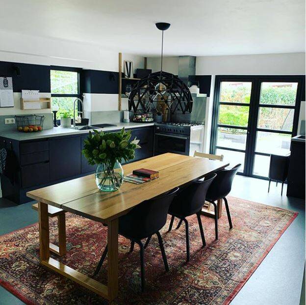 Toen we de basis van de keuken op orde hadden werd het tijd voor een persoonlijke touch. We kochten via Marktplaats een geweldig vloerkleed, erg handig met de kids, want zo zie je niet alle kruimels op de grond liggen. De zwarte rand op de muur was even een dingetje, maar we hebben er geen moment spijt van gehad. Het is echt een statement en daar houden we van! Op de foto's hieronder zie je een foto van voor en na de zwarte rand en dan is goed te zien wat de zwarte rand met de keuken doet. Het maakt het voor ons meer 'cozier'. Ook moderne kunst kreeg een plekje aan de muur iets waar ik erg van houd. Ik bestelde deze poster met eiken lijsten via Desenio, echt het kijken waard. Wat een keuze!