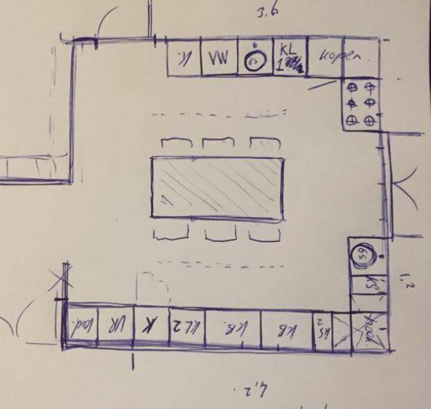 Zelf kom ik ook uit een groot gezin en daarom weet ik van huis uit wat praktisch is en wat minder handig is, wat betreft de indeling van een keuken. Mijn moeder is er een kei in om groots te denken en veel ideeën heb ik dan ook echt van haar meegekregen. Voordat we de keuken gingen tekenen op de plattegrond gingen we bedenken wat we zeker terug willen zien in de keuken.