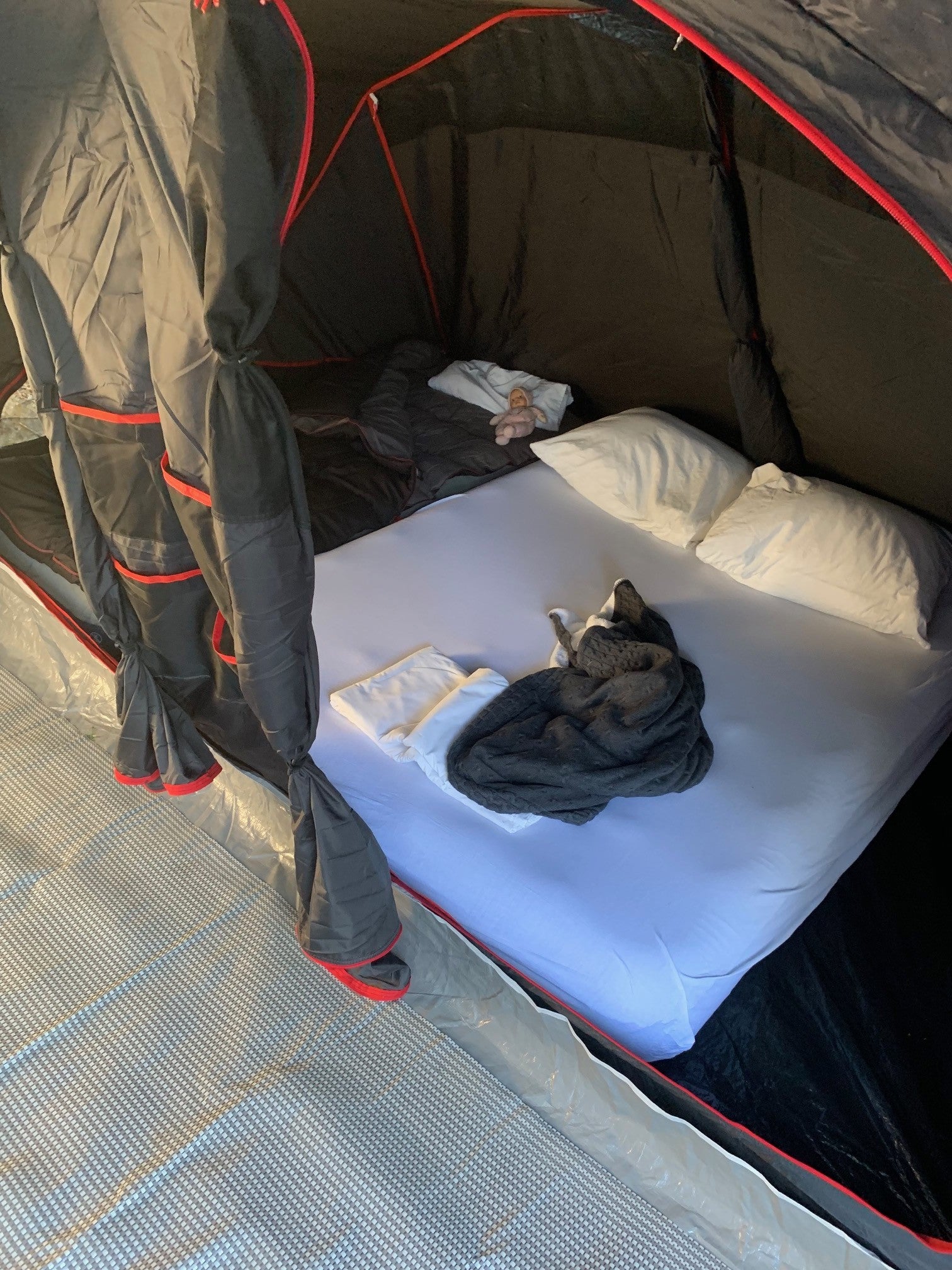 3. We vonden het jammer dat de deuren van de slaapcabines maar voor een klein deel uit gaas bestonden en de rest van een dichte zwarte stof. Het liefst zou ik de deur van de slaapcabines helemaal van gaas hebben, voor wat frisse lucht 's nachts en een minder claustrofobisch gevoel (waar ik toch een beetje gevoelig voor ben.) Dit geldt ook voor de voordeur. Er zit maar een klein stukje gaas in, wat mij betreft mag ook de voordeur helemaal voorzien zijn van gaas, op die manier kan de tent nog beter afkoelen door er een lekker fris briesje doorheen te laten waaien.