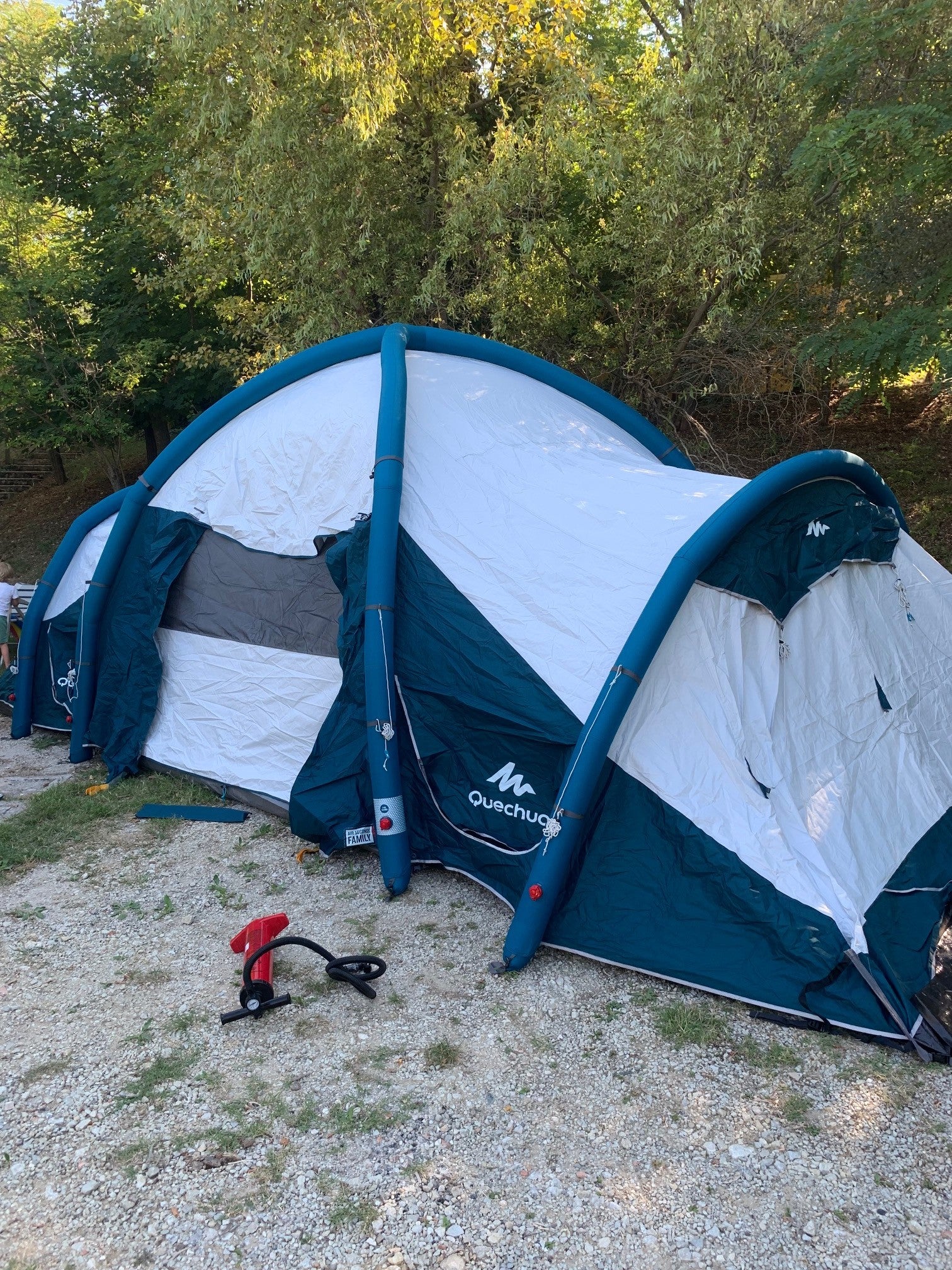 Het oppompen lijkt in het begin wat onwennig, maar dan komt er ineens beweging in de tent en komt de tent omhoog en eerlijk is eerlijk om 17:13 uur ligt de tent helemaal uit en 17.30 uur staat de tent helemaal op. Dat is mega snel. Voordeel is dat het grondzeil en de slaapcabines er al inhangen, daar winnen we weer veel tijd mee. We hoeven de tent alleen nog maar open te ritsen en we zijn er. Dit is echt heel fijn en zeker iets om heel blij van te worden. De kids hebben in die tussentijd geholpen door alvast spullen uit de aanhangwagen te pakken en ze hebben natuurlijk ook toegekeken hoe de tent de lucht inkwam (want dat maakte wel indruk). Dus ook voor hen duurde het opzetten niet lang.