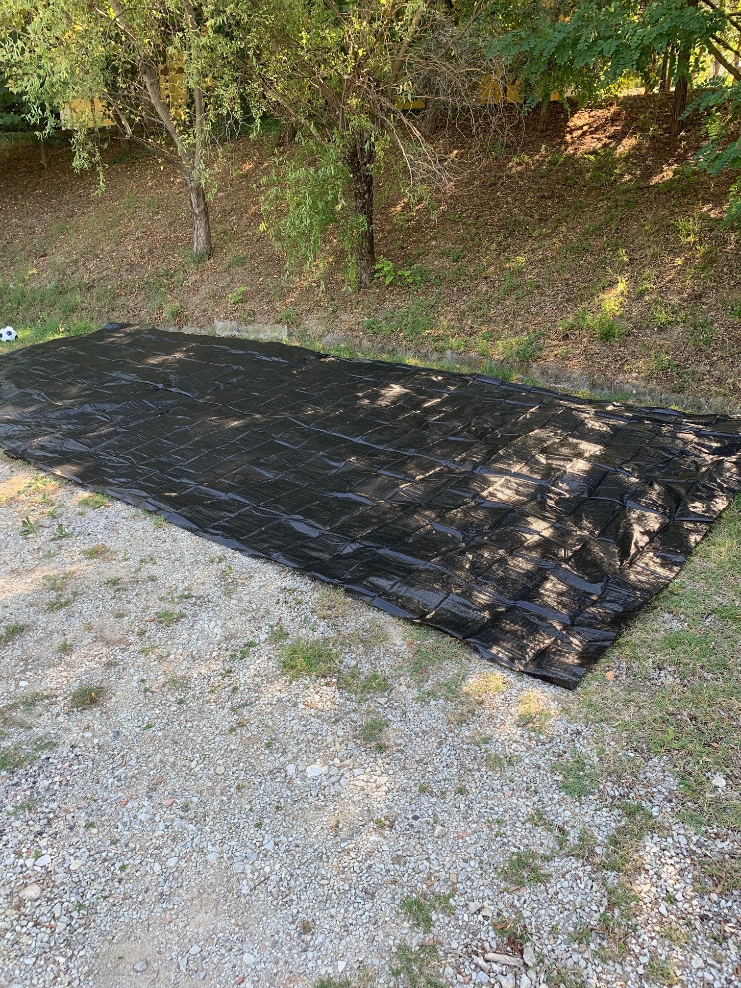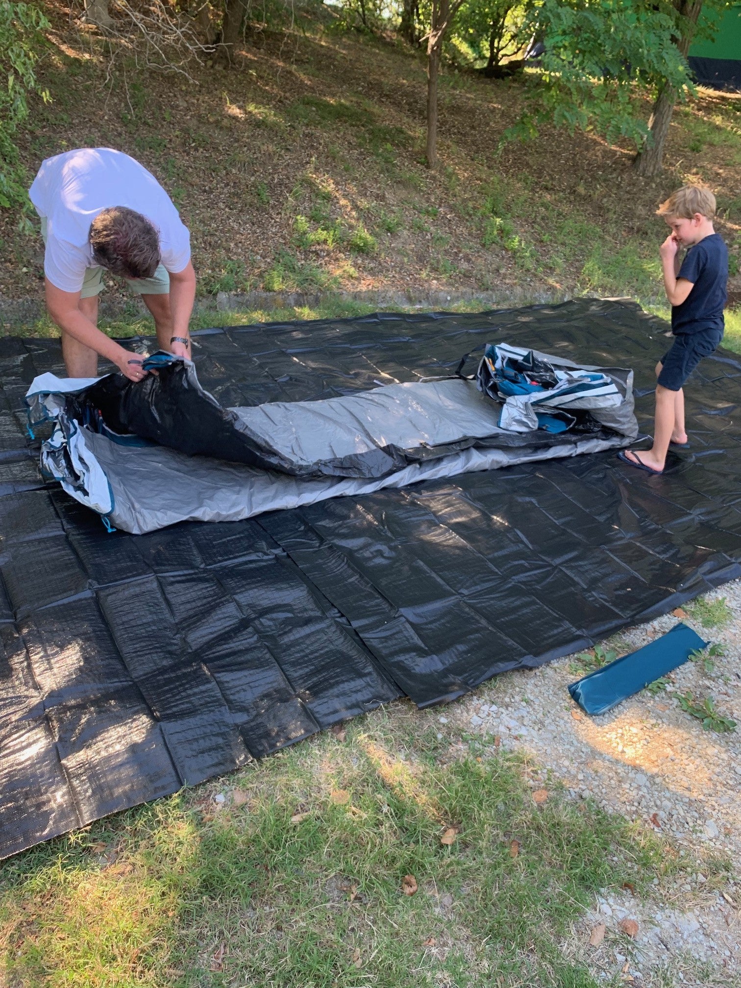 Allereerst hebben wij ecodoek (zwart grondzeil dat ademt) neergelegd voor onder de tent. Als het bijvoorbeeld hard regent kan het water hier goed doorheen weglopen en ook de groei van het gras van de standplaats wordt niet al te veel belemmerd.