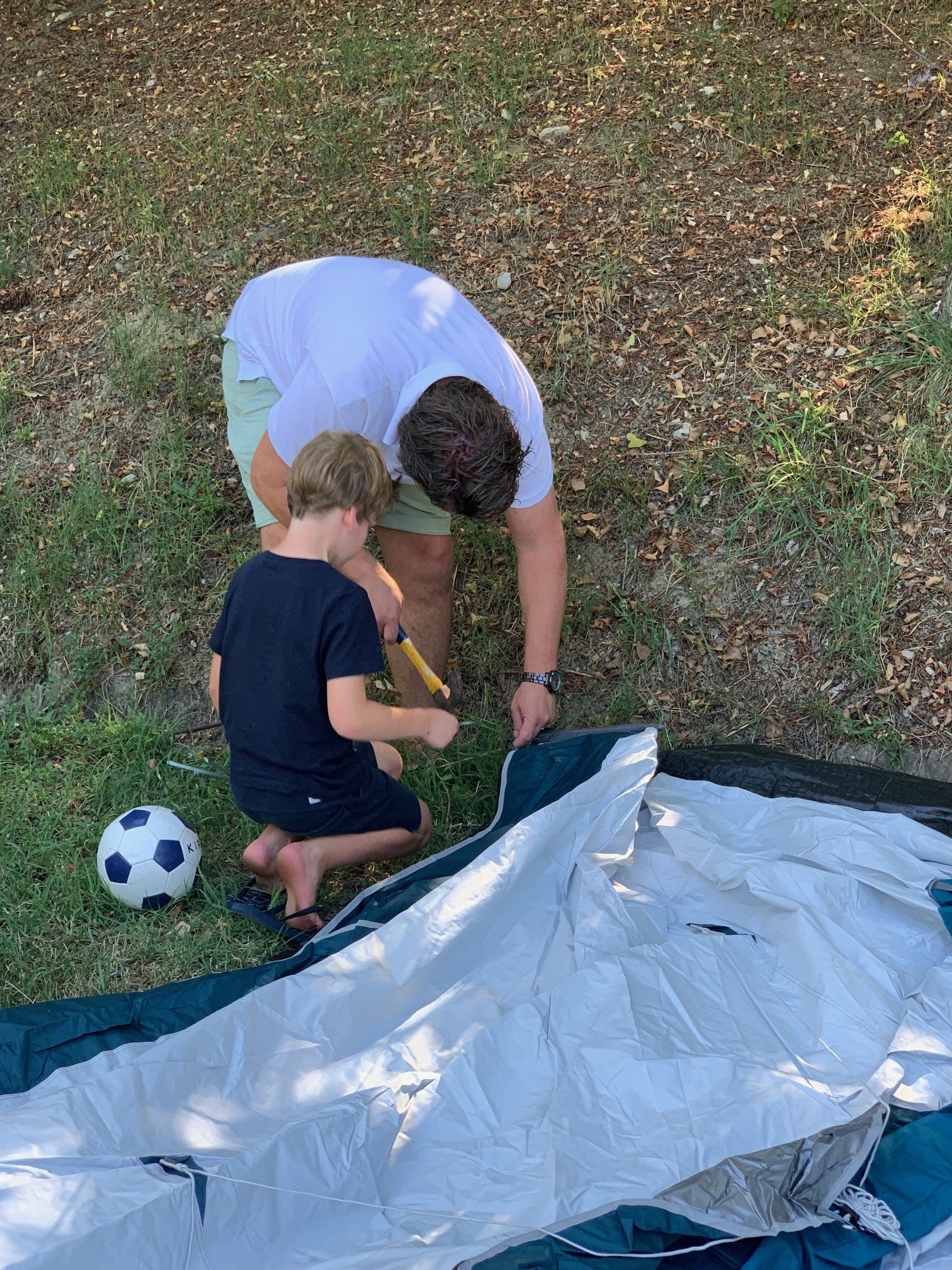 Na het oppompen heeft Mike de haringen van de scheerlijnen, etc. in de grond geslagen. Wij hebben de bijbehorende haringen wel vervangen door spijkerharingen, zodat we de harigen nog redelijk makkelijk in de rotsgrond konden slaan. Terwijl Mike de haringen erin aan het slaan was heb ik de elektra aangelegd en ben ik de luchtbedden gaan oppompen. Wat is dit handig zeg! Doordat de cabines er al inhangen en het grondzeil erin zit kun je direct beginnen met het inrichten van de tent. Ik heb de tussenwanden aan beide kanten van de cabines wel opgerold, omdat ik altijd van ruimte houd en daar komt bij dat Lieve nu net een jaar is geweest, dus houden we haar 's nachts ook graag een beetje in de gaten.