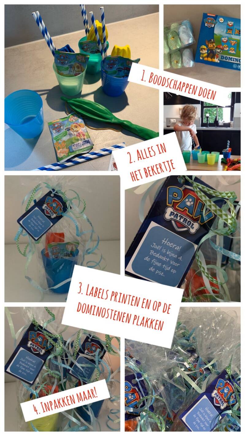 Wat gaat er in het bekertje? 2 rietjes (gewoon omdat dat gezellig staat), een ballon, een zakje Paw Patrol snoepjes en een doosje rozijntjes.